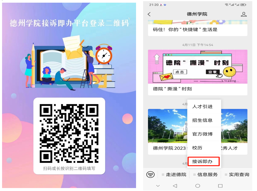 1、微信搜索关注【德州学院】公众号,找到【信息服务】-【接诉即办】菜单(也可通过学校官网首页“德州学院接诉即办平台”链接进入,或者微信扫“德州学院接诉即办平台登录二维码”进入)。