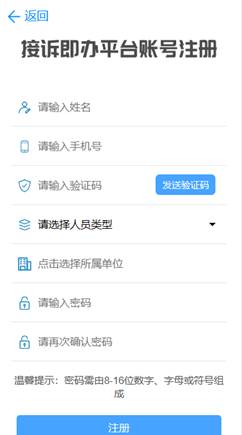2、使用平台需要注册账号。在平台登录页找到“注册账号”按钮,填写真实姓名、手机号(可接收短信验证码)、人员类型、所属单位以及登录密码等信息。信息填写完成后点击底部的“注册”按钮即可完成注册,在登录页面输入注册时填写的手机号和密码即可登录。