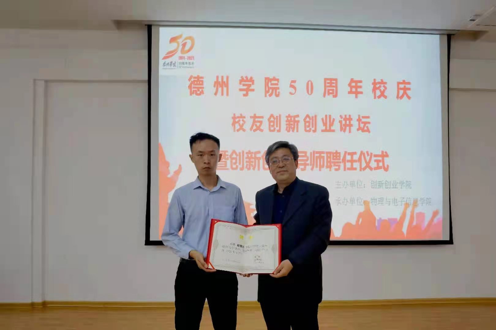 活动由副院长唐延柯教授主持,党总支书记赵庆福同志为赵建伟经理颁发了德州学院创新创业导师证书。赵建伟回顾了在母校学习生活的经历,表达了对学校、老师的感激之情以及对母校建校50周年的祝贺,表示一定会尽自己的绵薄之力,为母校的发展贡献力量。赵建伟校友用自己真实的工作经历描绘了物联网工程专业的发展前景,让同学们有了清晰且具体的专业认知,鼓舞了同学们的学习热情。他忠告同学们要抓住在校学习的大好时光,努力学习专业知识,争取到更高层次学校提升自己。最后他勉励大家要尽早确立奋斗目标,不轻言放弃,只要付出努力,一定会取得成功!