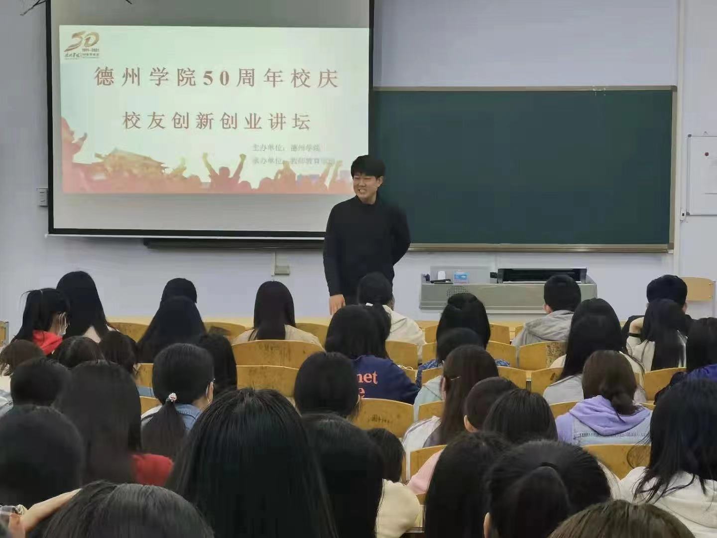 活动伊始,教师教育学院负责人为杰出校友孙胜男、薛宗翔颁发了德州学院创新创业导师聘书,孙胜男、薛宗翔回顾了在母校学习生活的经历,表达了对学校、老师的感激之情。随后薛宗翔则结合社会上的成功典型事例及自身的创业经历和经验,从多个方面深入浅出地为大家讲解一些关于大学生创业中容易遇到的问题,并就现场学生的提问行详细解答。孙胜男分享了自己多年的求职、就业、创业感悟,要求同学们在进入就业岗位前,一定要掌握职场礼仪。