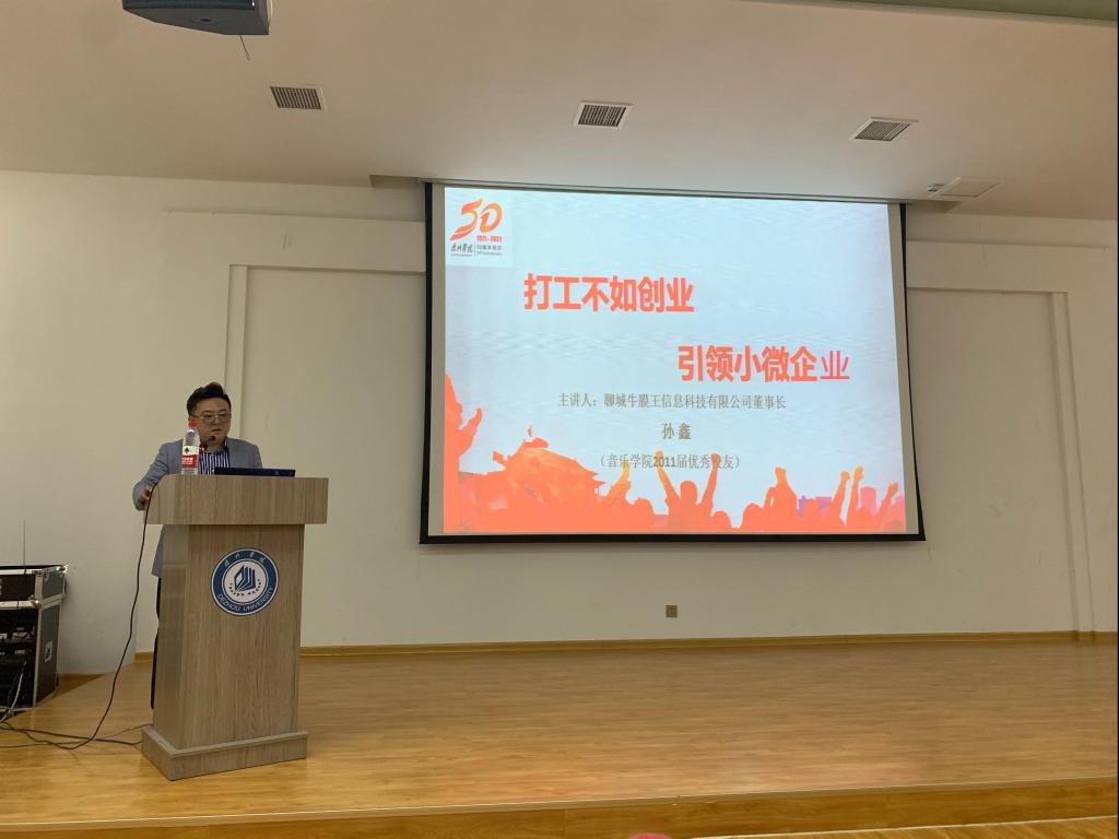 5月10日下午,德州学院50周年校庆之校友创新创业讲坛系列活动在七点创业谷路演厅举行。音乐学院2011届优秀校友、聊城牛膜王信息科技有限公司董事长孙鑫鑫作了题为“打工不如创业,引领小微企业”的报告,音乐学院党总支书记刘志华,音乐学院党总支副书记贺昱及音乐学院学生代表参加此次活动。