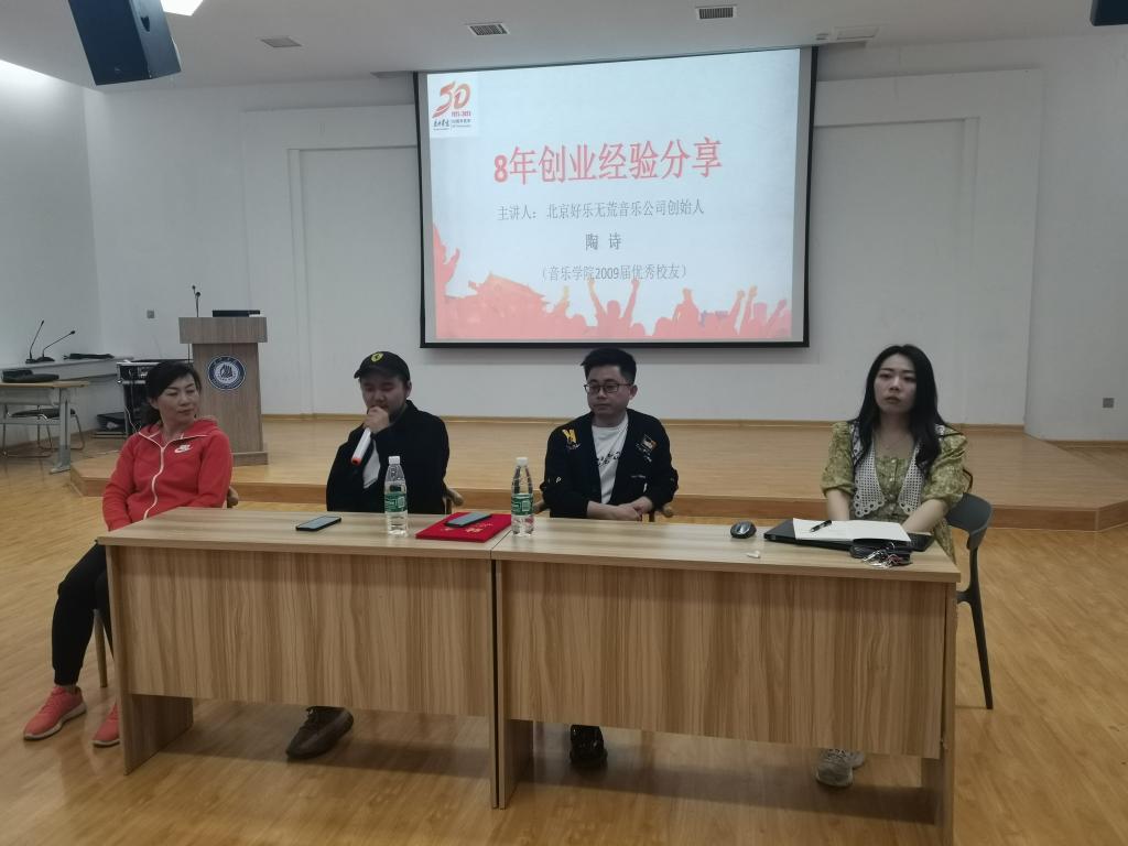 创业分享会以互动的形式进行,现场气氛活跃。陶诗的分享围绕是“寻找答案”中心,他从五个方面给学弟学妹们以启迪。一是选择大于努力,创业前要经过深思熟虑选,对行业方向更加重要,努力+资源就会有较大概率成功。二兴趣是最大的驱动力。陶诗用自己生动的例子证明了只有强烈的兴趣才能支撑创业者不断前进,最终取得成功。三要善于思考,勤于思考。在《星辰大海》制作过程当中,“我们的爱散落大海”,这一句经过陶诗不断的思考,改成了“我们的爱守护大海”,两个字的改变结合当时抗疫的背景,才使得整首歌得以推广,取得巨大成功。四要专注于自己从事的行业,不懈深耕。好乐无荒制作团队每个月制作一首歌,并专心做推广,使得首首爆火,成功率几乎为100%。专注细节,在行业深耕,才能制作出精品,踏实前进。五不要怕犯错误,每次错误都是在排除错误选项,使产品不断迭代提升。有试错才会有进步,在不断总结经验的基础上,才能避免更大的失误。在座学生频频发起热烈掌声,并与学长积极互动,寻求优秀校友答疑解惑。