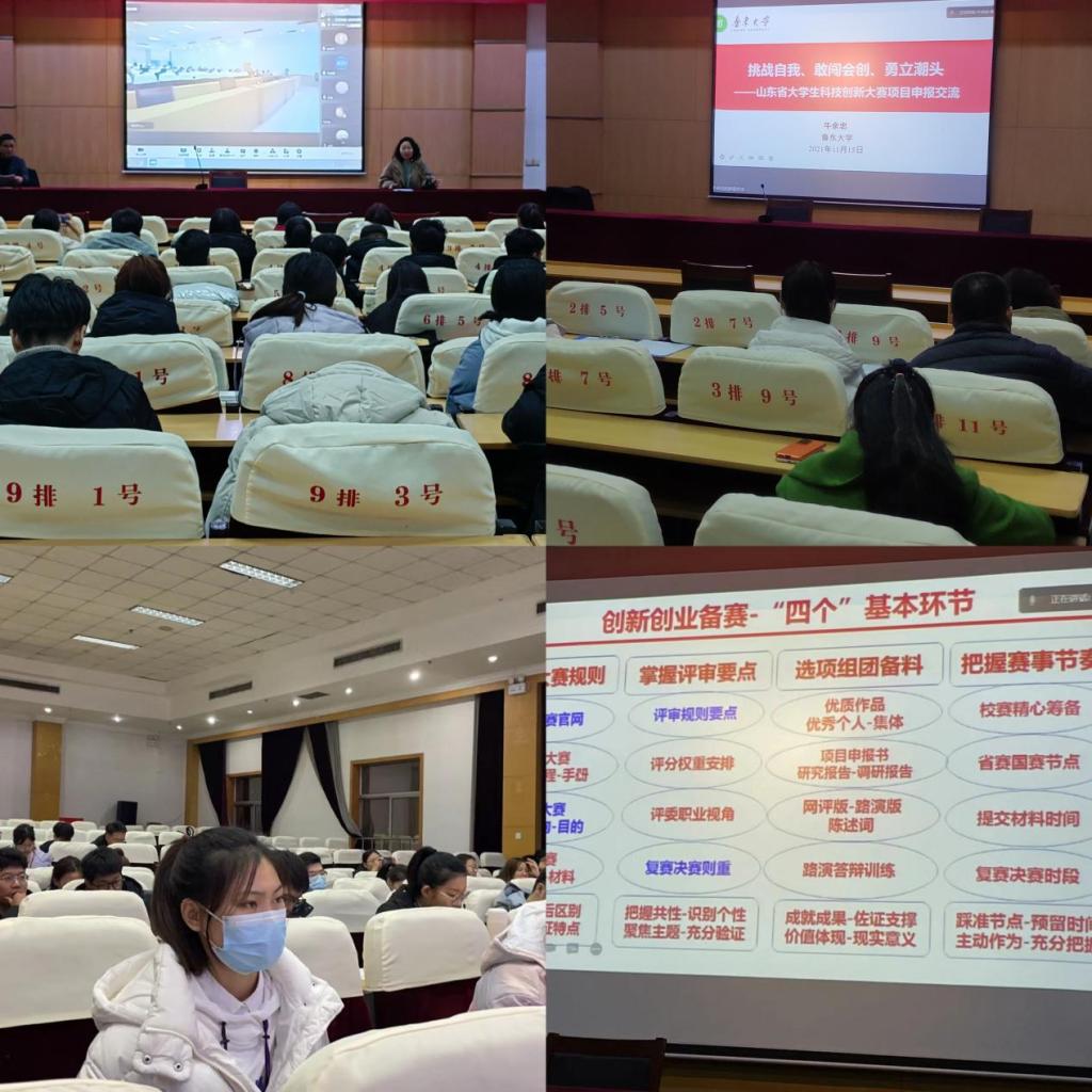 牛余忠教授结合自身的教学科研经历和多年指导大学生科创比赛的经验,以《挑战自我、敢闯会创、勇立潮头——山东省大学生科技创新大赛项目申报交流》为题做了一场精彩的汇报。牛教授从大学生创新创业竞赛“为什么”和“怎么做”两个角度,介绍了大学生创新创业是国家战略导向和高校发展的自身需求,对科创比赛的“科学性”、“创新性”和“实用性”进行了精准的解读,并从“通晓大赛规则、掌握评审要点、选项组团备料、把握赛事节奏”四个方面介绍了备赛的基本环节,随后就大家所关心的山东省大学生科技创新大赛项目申报书的撰写和评审指标进行了详细分析,最后对我校项目申报中学生遇到的问题进行了一一解答。