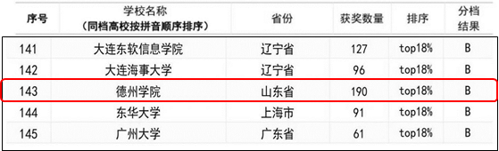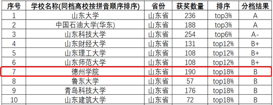 本轮发布的全国普通高校创新创业类竞赛研究报告对分数段前54%的高校按不同的比例划分为九档,我校属于TOP12-18%(含)B档,位列第143位,在山东省高校中位列第7位,山东省同档高校中,我校获奖数量最多,为190项。