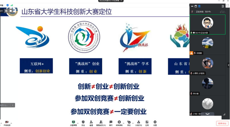 11月21日下午,我校女人18片毛片60分邀请青岛科技大学创新创业教育学院创业办主任刘夕升为我校师生举办了一场题为“省科创大赛准备过程中需要做点啥?—基于山东省大学生科技创新大赛的思考”的创新创业教育专题讲座,讲座以腾讯会议形式举行。